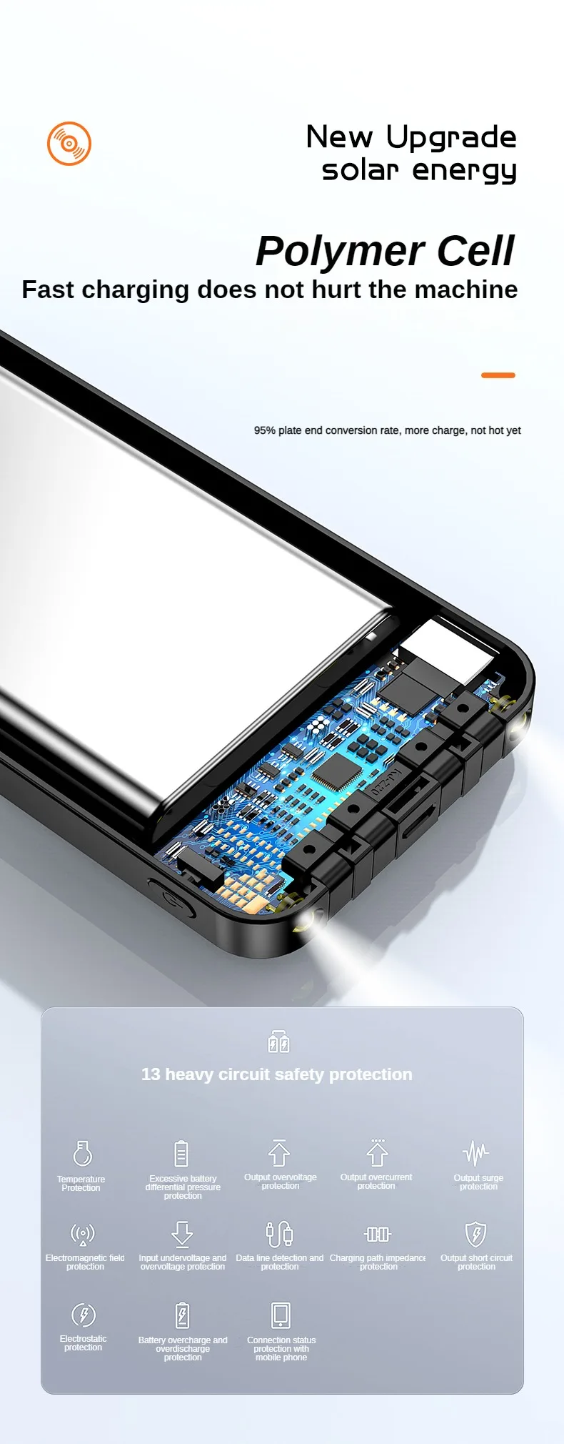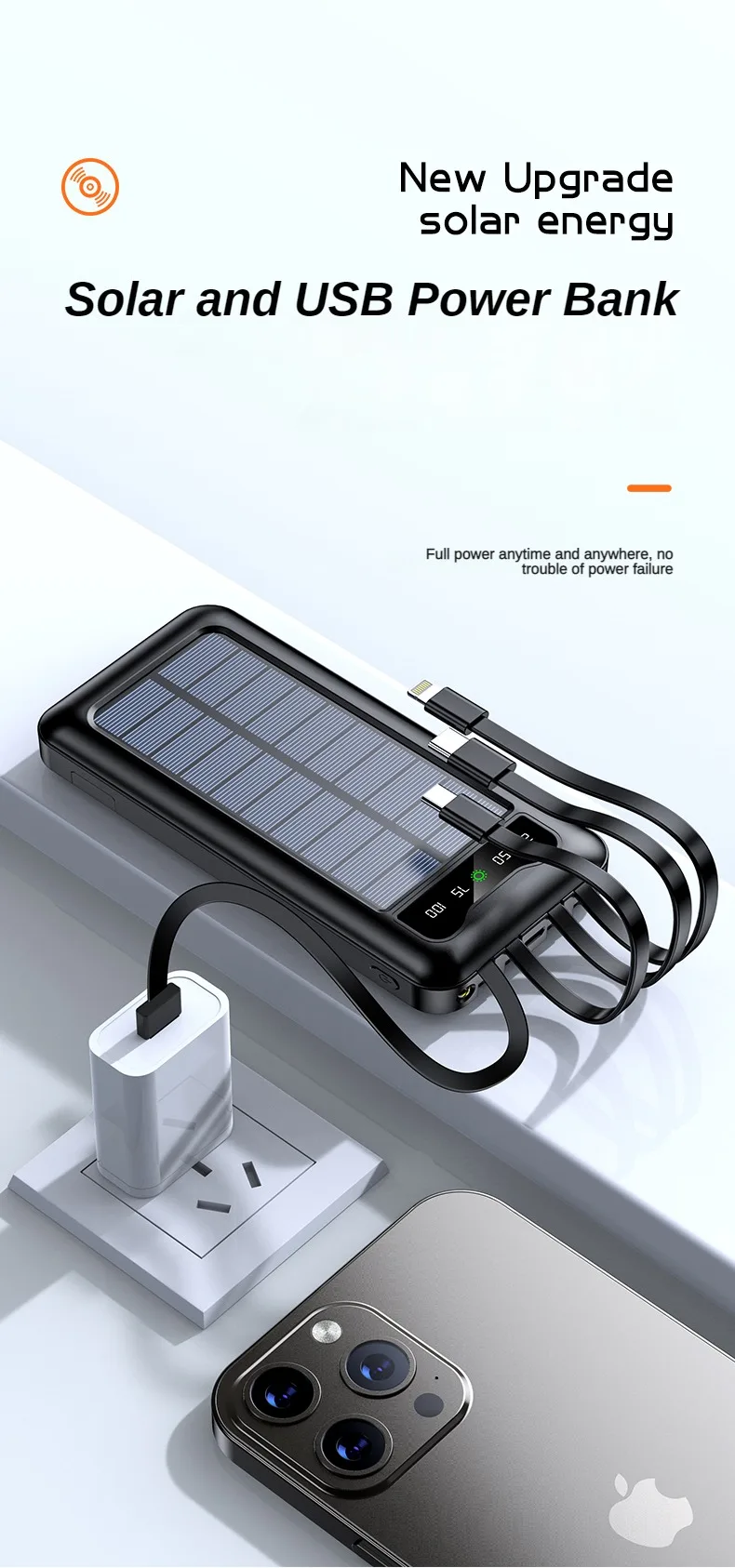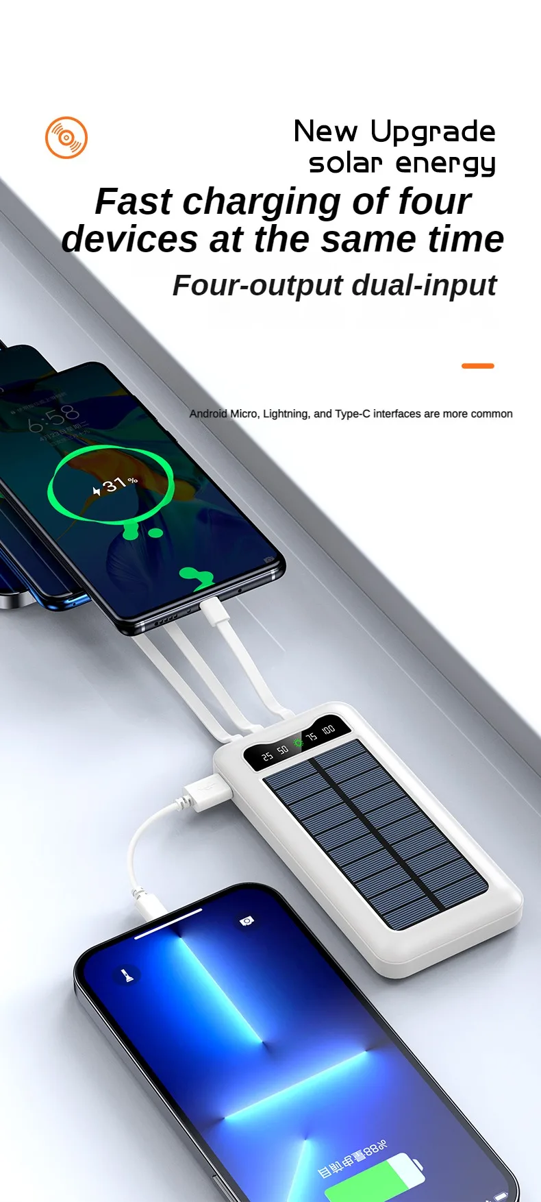 El banco de energía solar de 30000mAh es una revolucionaria solución para aquellos que necesitan mantener sus dispositivos cargados mientras están en movimiento. Equipado con paneles solares de alta eficiencia, este banco de energía ofrece una fuente sostenible y renovable de carga, permitiendo cargar tus dispositivos de manera ecológica y sin límites.