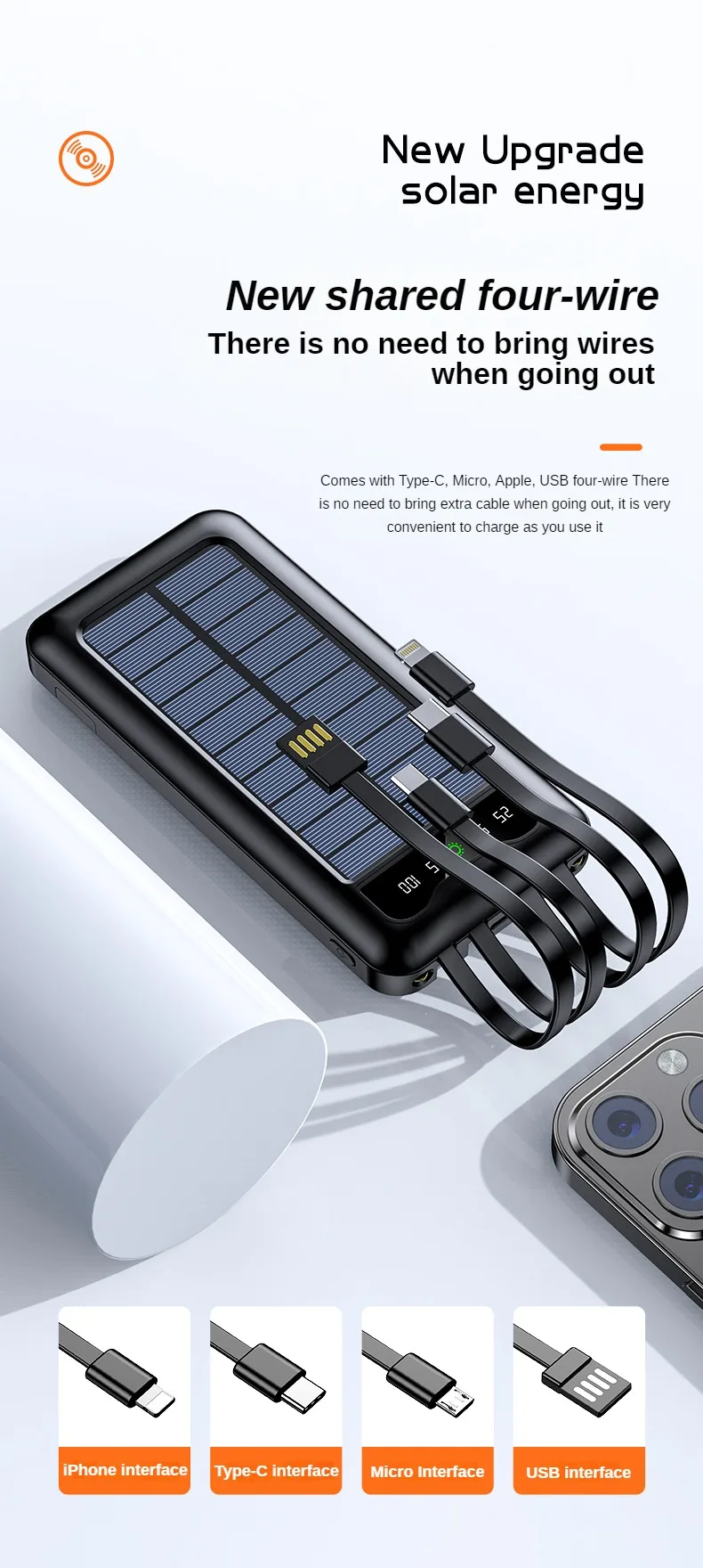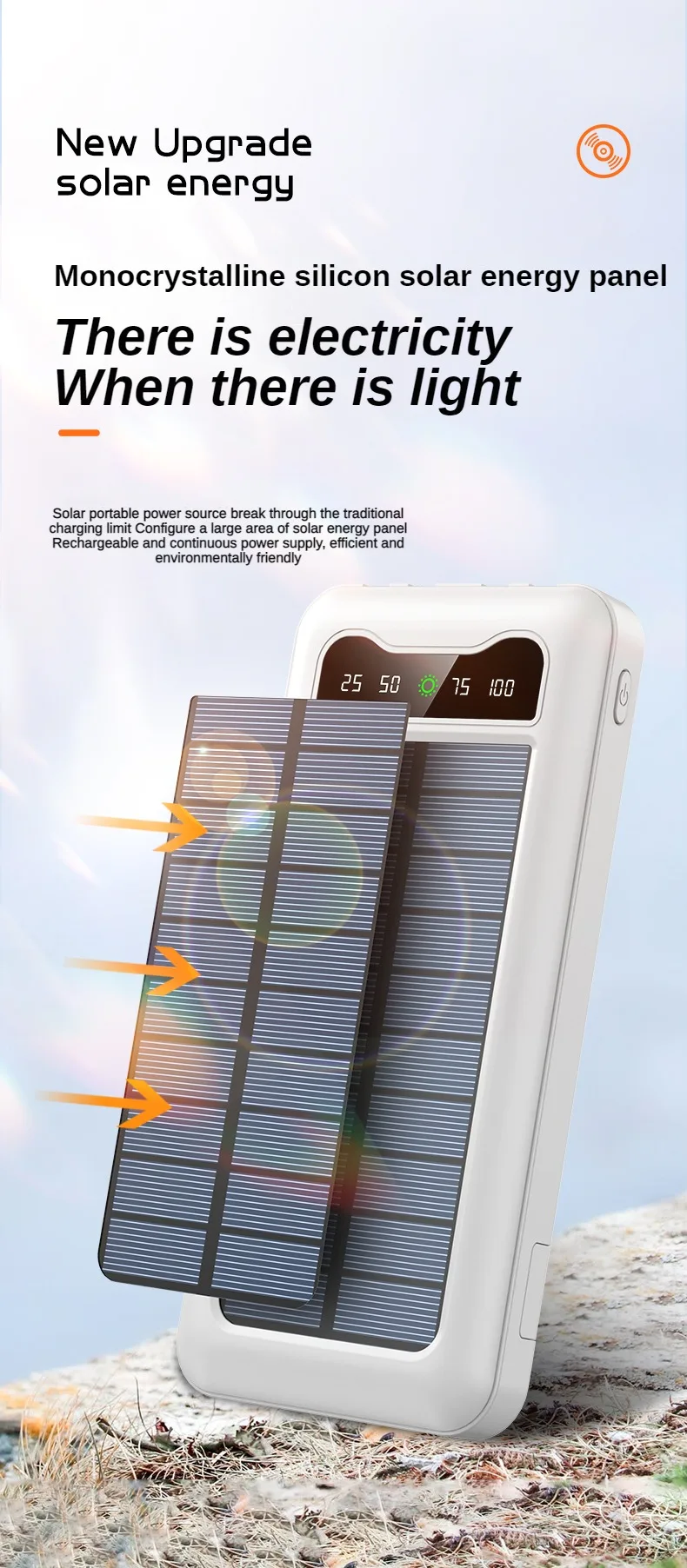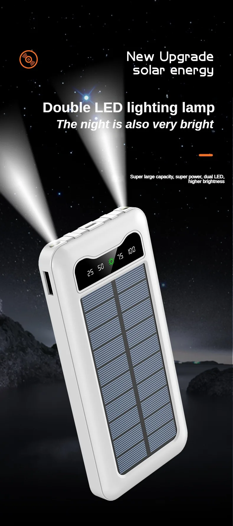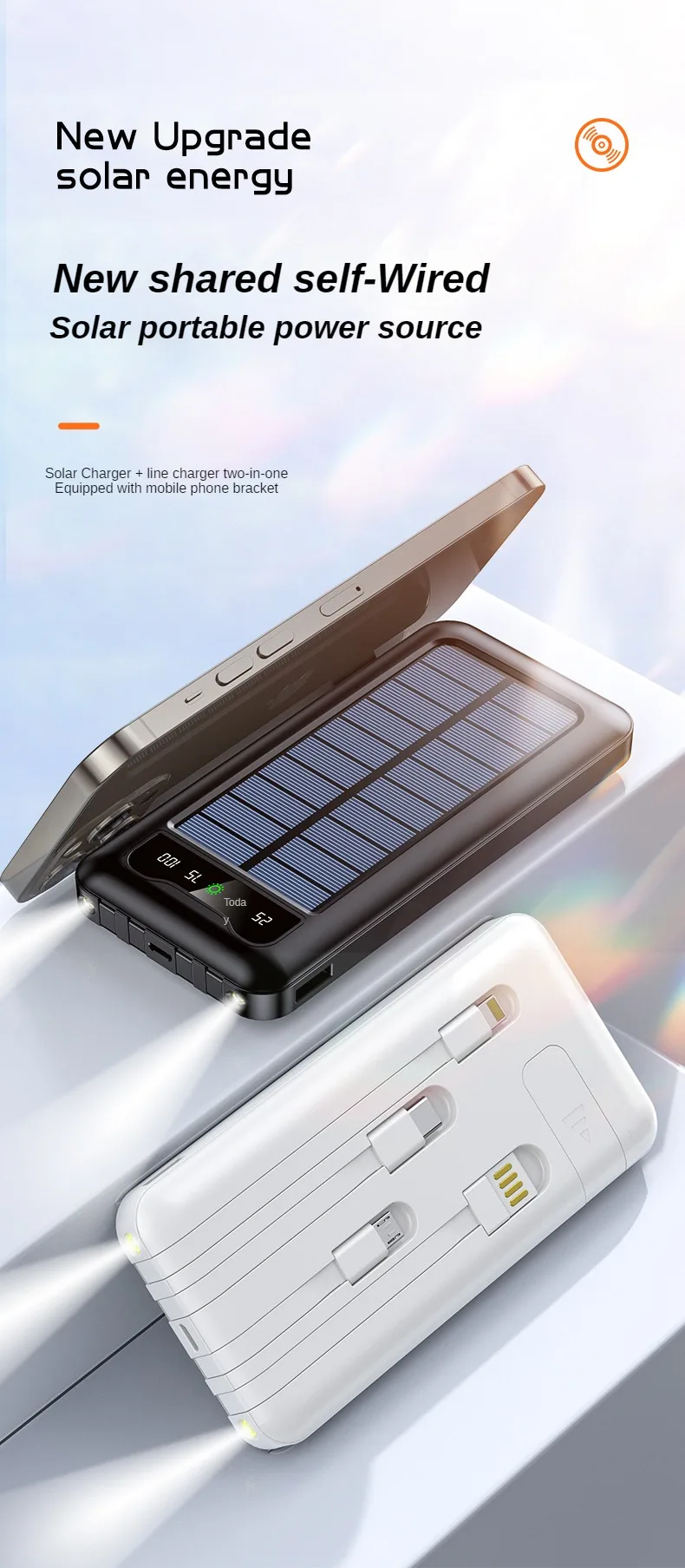 El banco de energía solar de 30000mAh es una revolucionaria solución para aquellos que necesitan mantener sus dispositivos cargados mientras están en movimiento. Equipado con paneles solares de alta eficiencia, este banco de energía ofrece una fuente sostenible y renovable de carga, permitiendo cargar tus dispositivos de manera ecológica y sin límites.