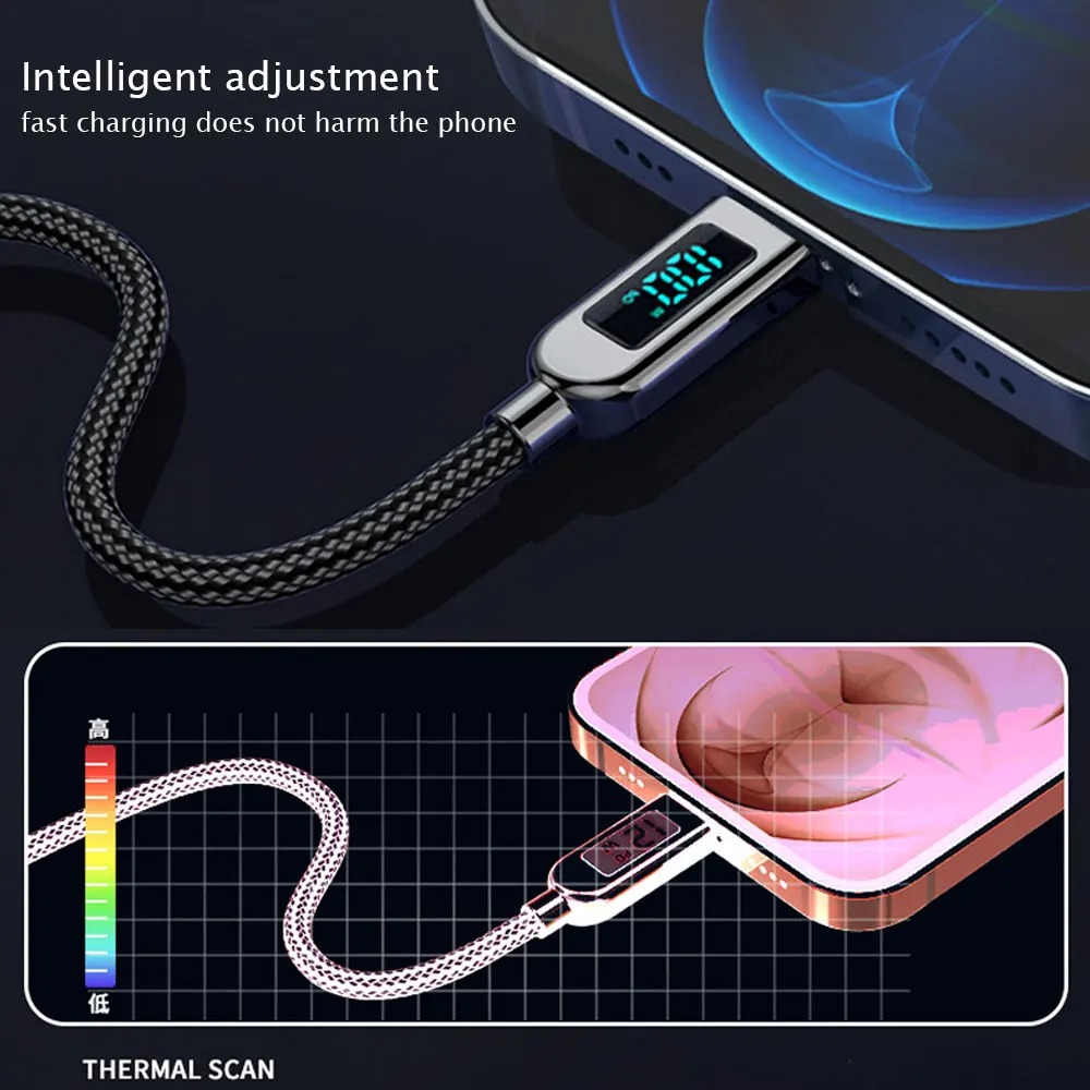 La característica estrella de nuestro Cable de Carga Rápida Tipo C a Tipo C es su pantalla digital integrada. Olvídate de las conjeturas y las suposiciones sobre el estado de carga de tus dispositivos. Con esta pantalla, puedes monitorear en tiempo real el nivel de carga y ajustar tu rutina según tus necesidades. Mantén un ojo en el progreso y nunca más te preocupes por quedarte sin energía en los momentos más importantes.